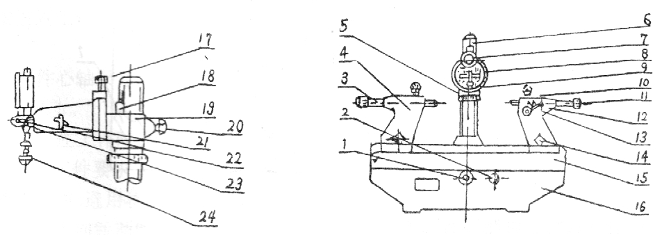 1.胶木手柄  2.胶木螺帽  3.顶针  4.左顶针架  5.升降螺帽  6.立柱  7.千分表  8.测量支架  9.测量头  10.胶木螺钉  11.M4胶木螺钉  12.右顶针架  13.手柄  14.胶木螺帽  15.台面  16.底座  17.紧固螺钉  18.指标块  19.测量座  20.胶木螺钉  21.手柄  22.螺钉  23.表架  24.接头