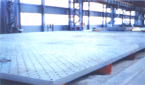 造船用火工平板材质:强度铸铁HT200-300或QT,工作面硬度为HB170-240,经过两次人工处(人工退火600度-700度和自然时效2-3年)使用该火工平台精度稳定,耐磨性能好。